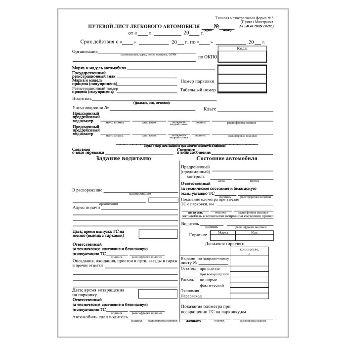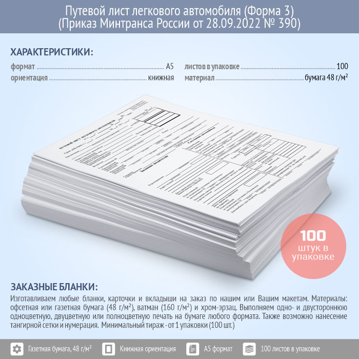 Путевой лист легкового автомобиля (Форма № 3) (Приказ Минтранса России от 28.09.2022 № 390) (упаковка из 100 штук) в Хотьково купить