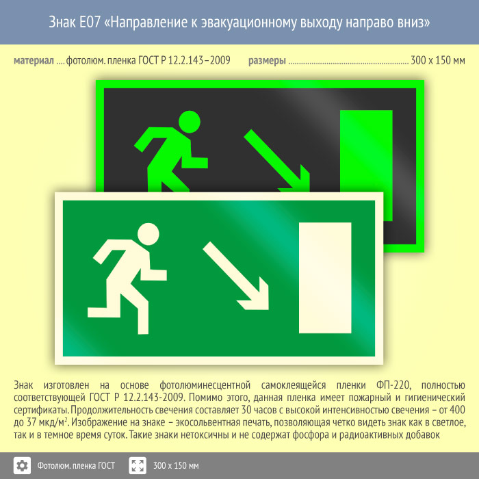 Знак E07 «Направление к эвакуационному выходу направо вниз» (фотолюминесцентная пленка ГОСТ 34428-2018, 300х150 мм) в Хотьково купить