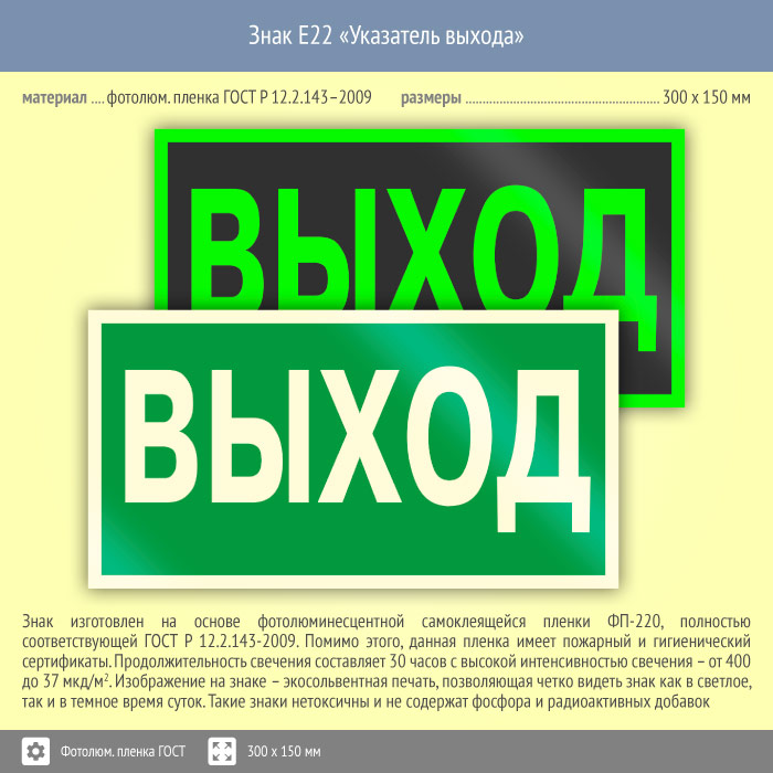 Знак E22 «Указатель выхода» (фотолюминесцентная пленка ГОСТ 34428-2018, 300х150 мм) в Хотьково купить