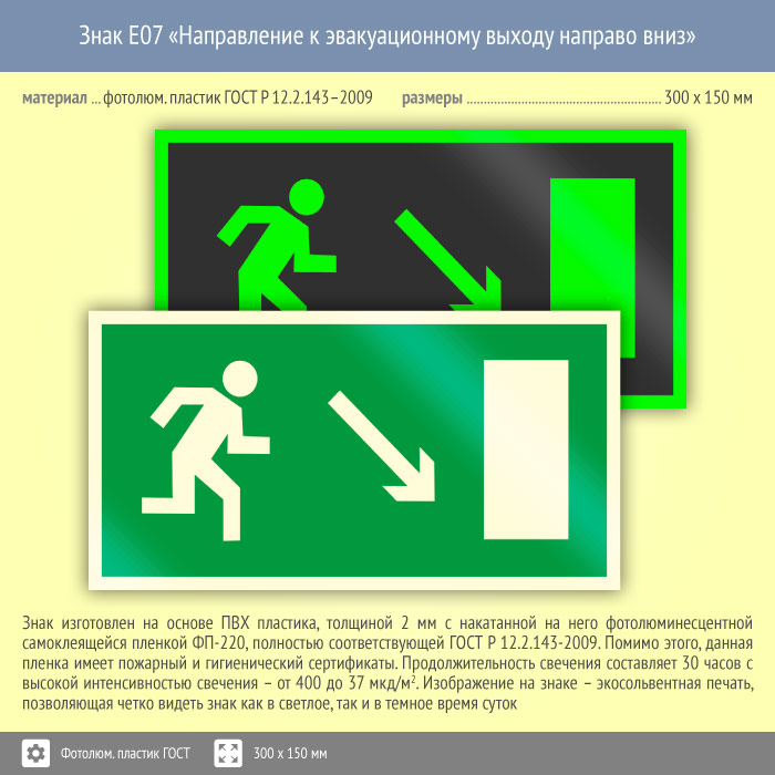 Знак E07 «Направление к эвакуационному выходу направо вниз» (фотолюминесцентный пластик ГОСТ 34428-2018, 300х150 мм) в Хотьково купить