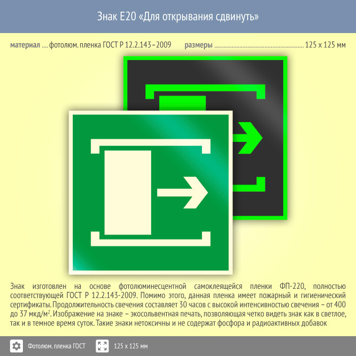 Знак E20 «Для открывания сдвинуть» (фотолюминесцентная пленка ГОСТ 34428-2018, 125х125 мм) в Хотьково купить