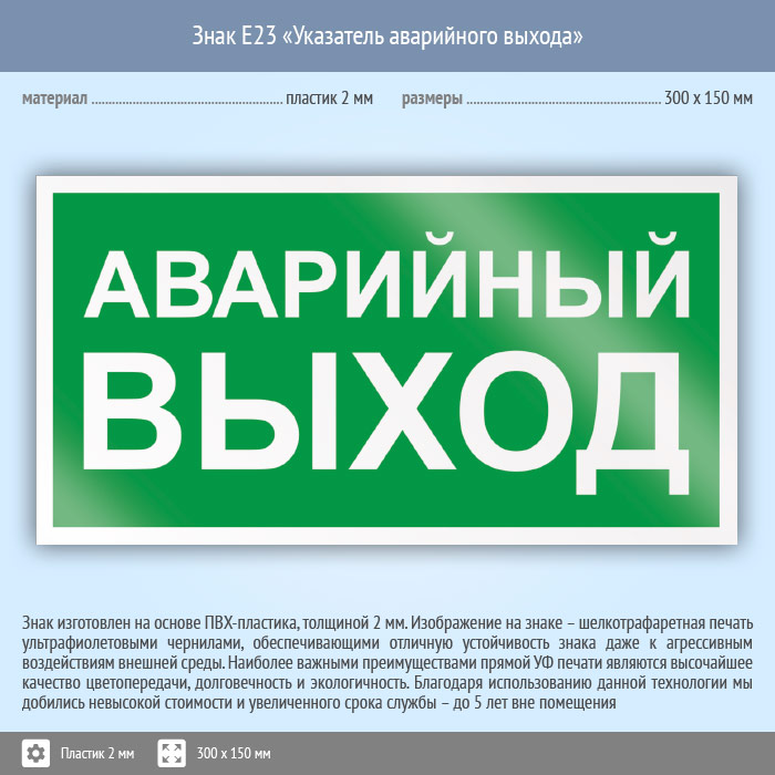 Знак E23 «Указатель аварийного выхода» (пластик, 300х150 мм) в Хотьково купить