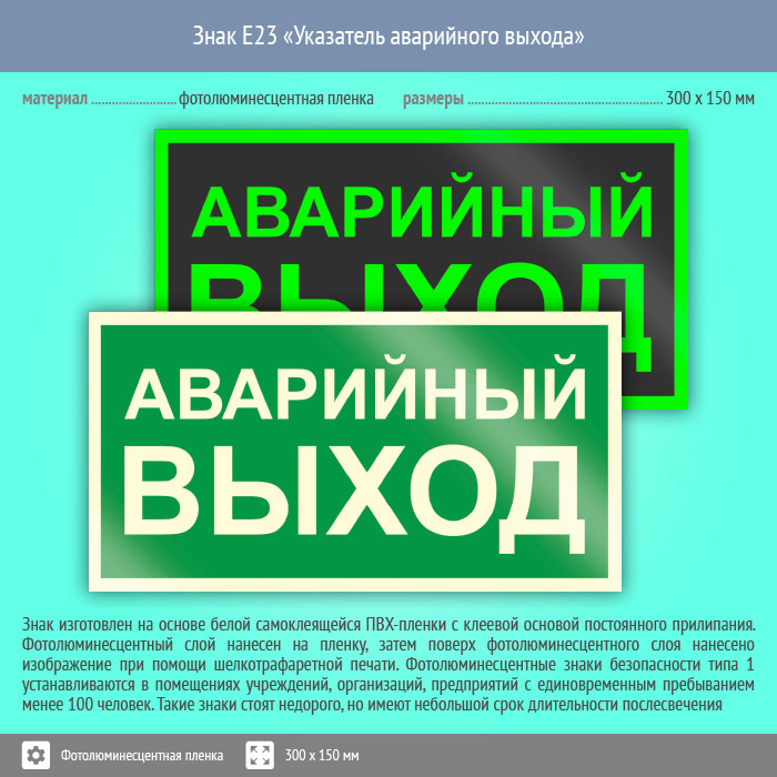 Знак E23 «Указатель аварийного выхода» (фотолюминесцентная пленка, 300х150 мм) в Хотьково купить