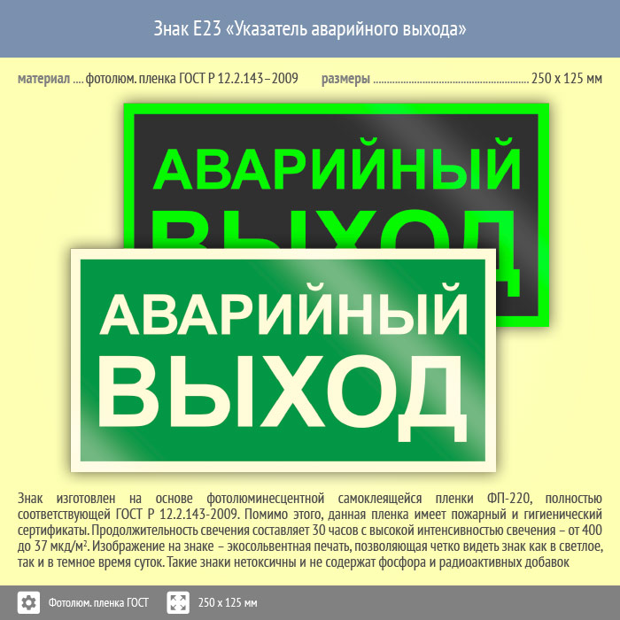 Знак E23 «Указатель аварийного выхода» (фотолюминесцентная пленка ГОСТ 34428-2018, 250х125 мм) в Хотьково купить