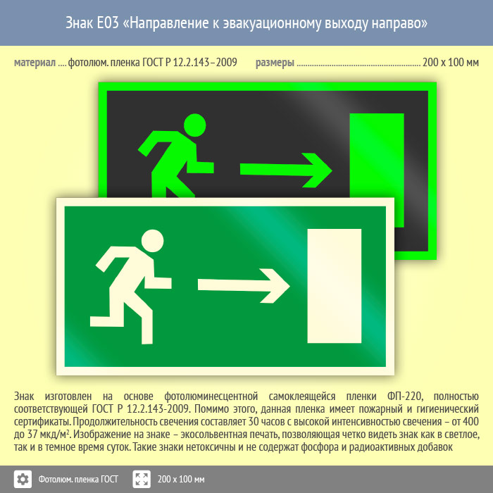 Знак E03 «Направление к эвакуационному выходу направо» (фотолюминесцентная пленка ГОСТ 34428-2018, 200х100 мм) в Хотьково купить