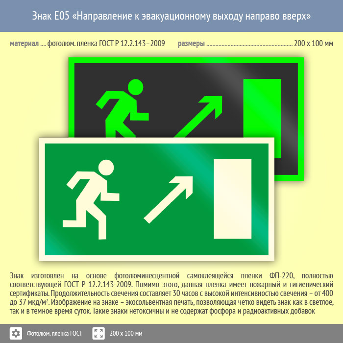 Знак E05 «Направление к эвакуационному выходу направо вверх» (фотолюминесцентная пленка ГОСТ 34428-2018, 200х100 мм) в Хотьково купить