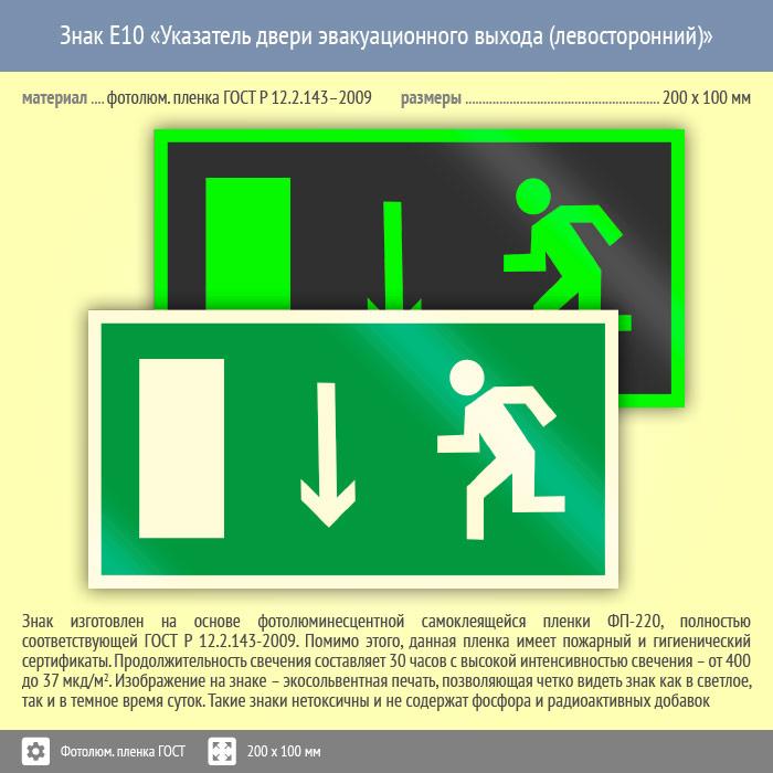 Знак E10 «Указатель двери эвакуационного выхода (левосторонний)» (фотолюминесцентная пленка ГОСТ 34428-2018, 200х100 мм) в Хотьково купить
