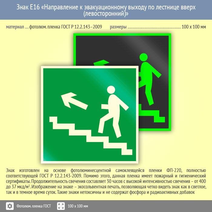Знак E16 «Направление к эвакуационному выходу по лестнице вверх (левосторонний)» (фотолюминесцентная пленка ГОСТ 34428-2018, 100х100 мм) в Хотьково купить