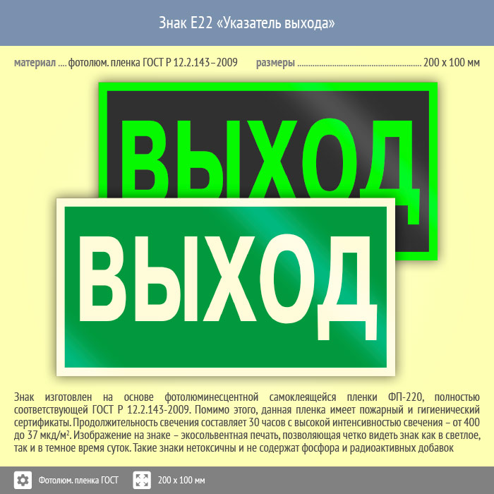 Знак E22 «Указатель выхода» (фотолюминесцентная пленка ГОСТ 34428-2018, 200х100 мм) в Хотьково купить