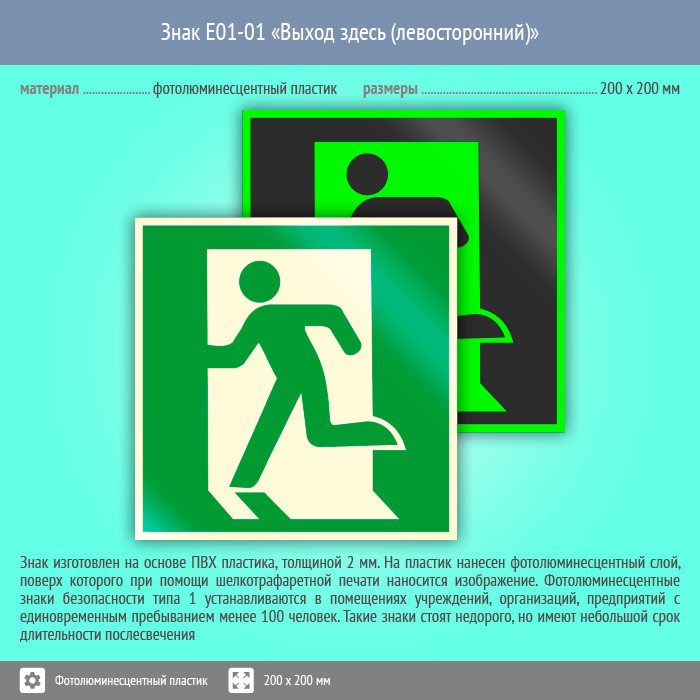Знак E01-01 «Выход здесь (левосторонний)» (фотолюминесцентный пластик, 200х200 мм) в Хотьково купить
