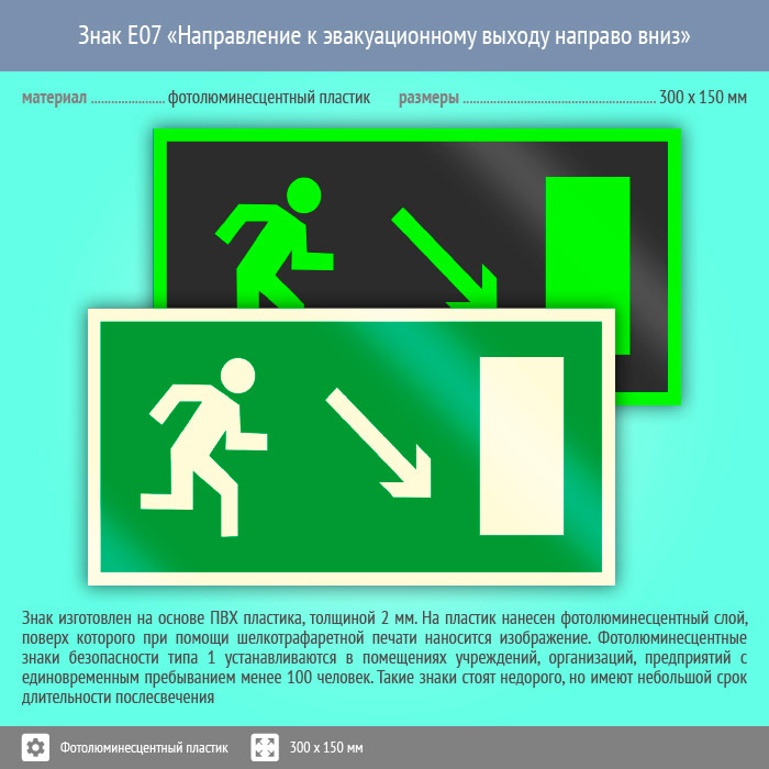 Знак E07 «Направление к эвакуационному выходу направо вниз» (фотолюминесцентный пластик, 300х150 мм) в Хотьково купить