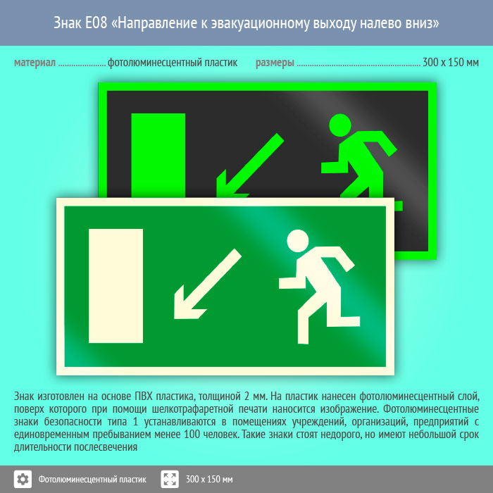 Знак E08 «Направление к эвакуационному выходу налево вниз» (фотолюминесцентный пластик, 300х150 мм) в Хотьково купить
