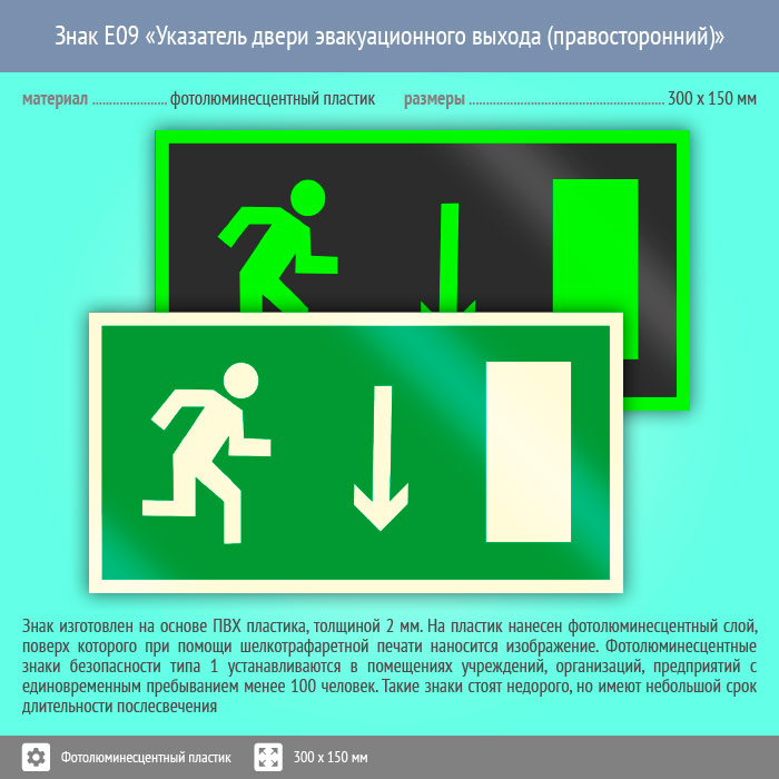 Знак E09 «Указатель двери эвакуационного выхода (правосторонний)» (фотолюминесцентный пластик, 300х150 мм) в Хотьково купить