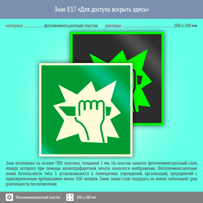 Знак E17 «Для доступа вскрыть здесь» (фотолюминесцентный пластик, 200х200 мм) в Хотьково купить
