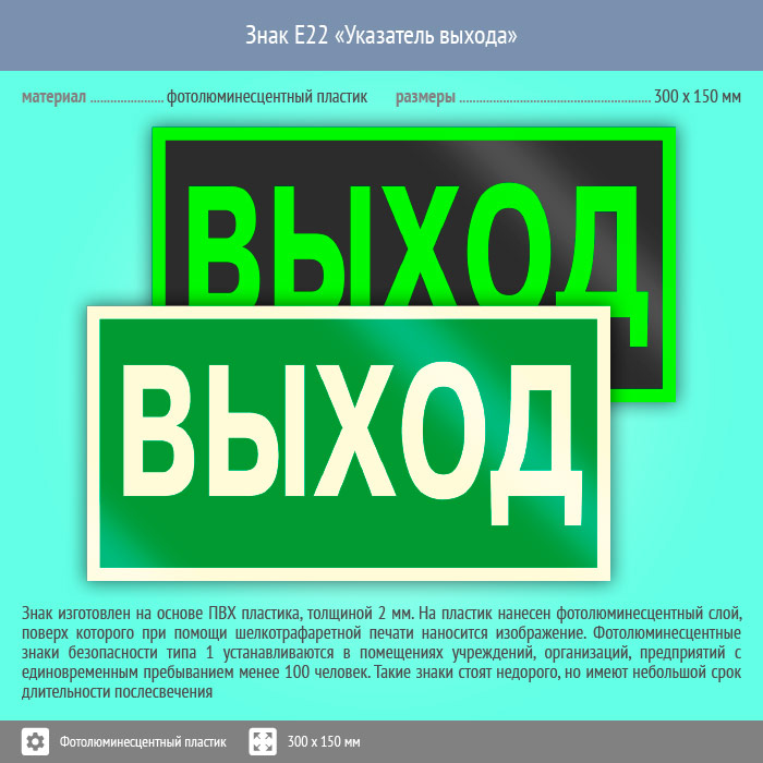 Знак E22 «Указатель выхода» (фотолюминесцентный пластик, 300х150 мм) в Хотьково купить