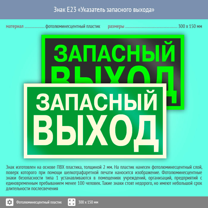 Знак E23 «Указатель запасного выхода» (устаревший) (фотолюминесцентный пластик, 300х150 мм) в Хотьково купить