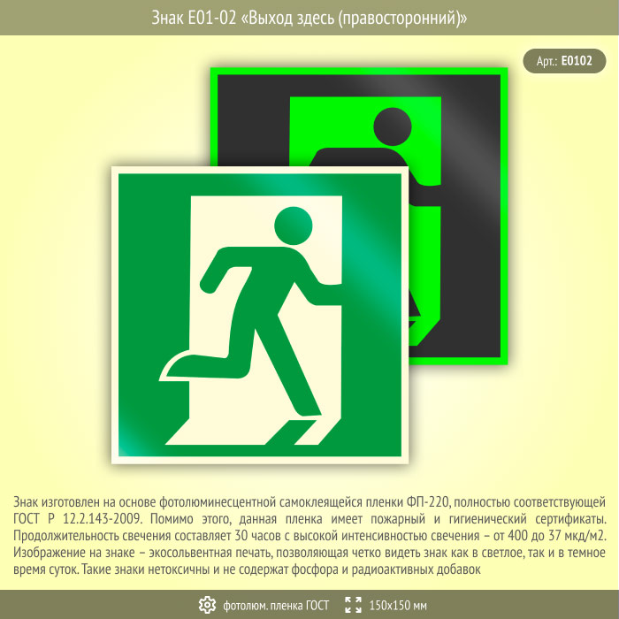 Знак E01-02 «Выход здесь (правосторонний)» (фотолюминесцентная пленка ГОСТ 34428-2018, 150х150 мм) в Хотьково купить