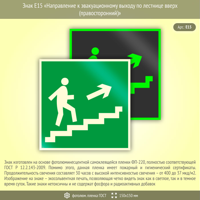 Знак E15 «Направление к эвакуационному выходу по лестнице вверх (правосторонний)» (фотолюминесцентная пленка ГОСТ 34428-2018, 150х150 мм) в Хотьково купить