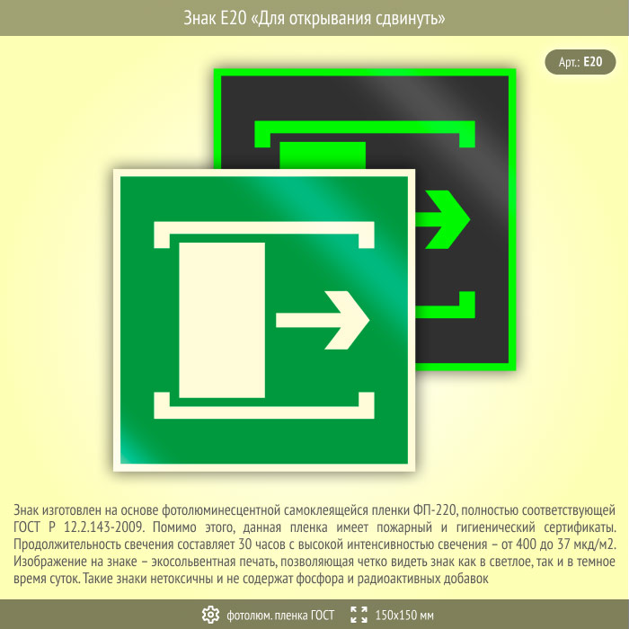 Знак E20 «Для открывания сдвинуть» (фотолюминесцентная пленка ГОСТ 34428-2018, 150х150 мм) в Хотьково купить