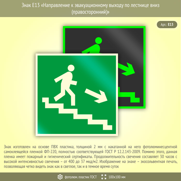 Знак E13 «Направление к эвакуационному выходу по лестнице вниз (правосторонний)» (фотолюминесцентный пластик ГОСТ 34428-2018, 100х100 мм) в Хотьково купить