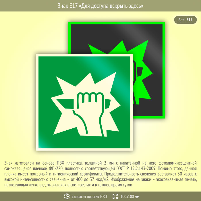 Знак E17 «Для доступа вскрыть здесь» (фотолюминесцентный пластик ГОСТ 34428-2018, 100х100 мм) в Хотьково купить