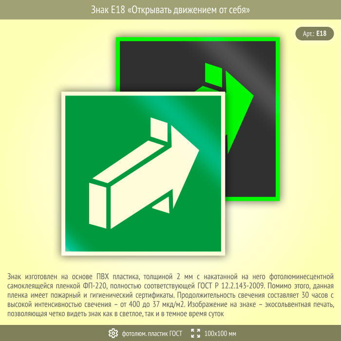 Знак E18 «Открывать движением от себя» (фотолюминесцентный пластик ГОСТ 34428-2018, 100х100 мм) в Хотьково купить
