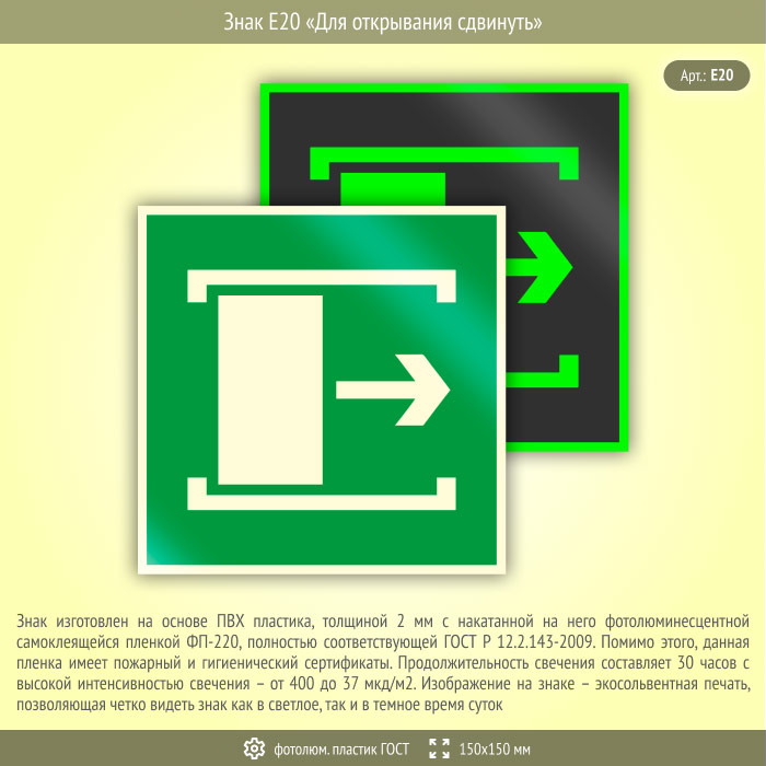 Знак E20 «Для открывания сдвинуть» (фотолюминесцентный пластик ГОСТ 34428-2018, 150х150 мм) в Хотьково купить