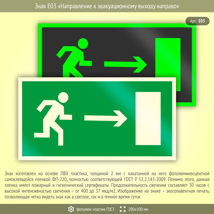 Знак E03 «Направление к эвакуационному выходу направо» (фотолюминесцентный пластик ГОСТ 34428-2018, 200х100 мм) в Хотьково купить
