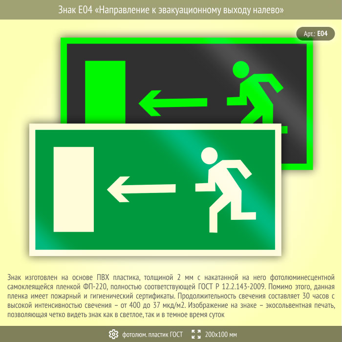 Знак E04 «Направление к эвакуационному выходу налево» (фотолюминесцентный пластик ГОСТ 34428-2018, 200х100 мм) в Хотьково купить