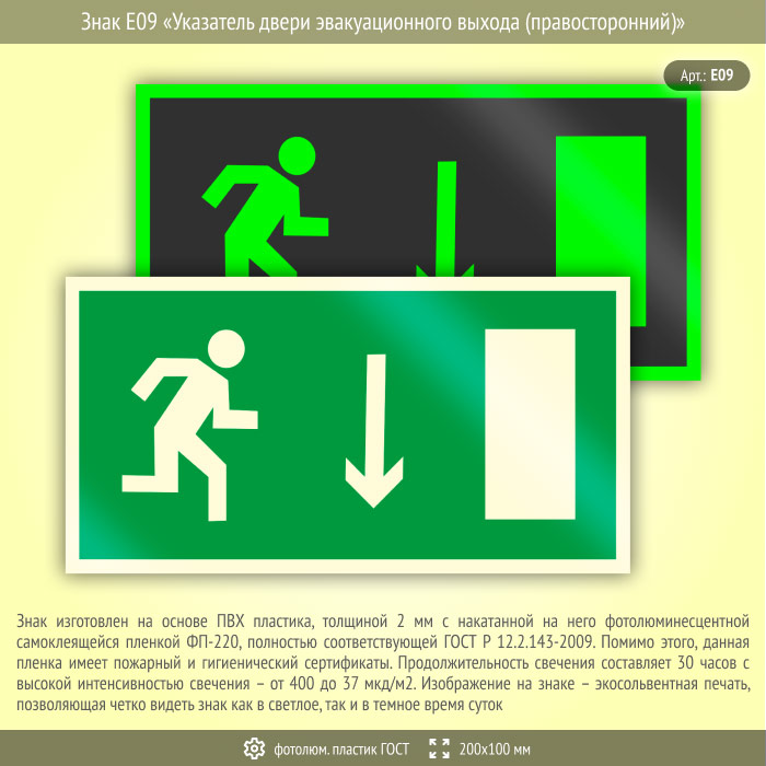 Знак E09 «Указатель двери эвакуационного выхода (правосторонний)» (фотолюминесцентный пластик ГОСТ 34428-2018, 200х100 мм) в Хотьково купить