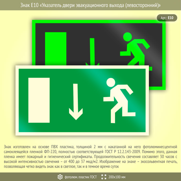 Знак E10 «Указатель двери эвакуационного выхода (левосторонний)» (фотолюминесцентный пластик ГОСТ 34428-2018, 200х100 мм) в Хотьково купить