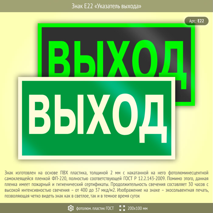 Знак E22 «Указатель выхода» (фотолюминесцентный пластик ГОСТ 34428-2018, 200х100 мм) в Хотьково купить