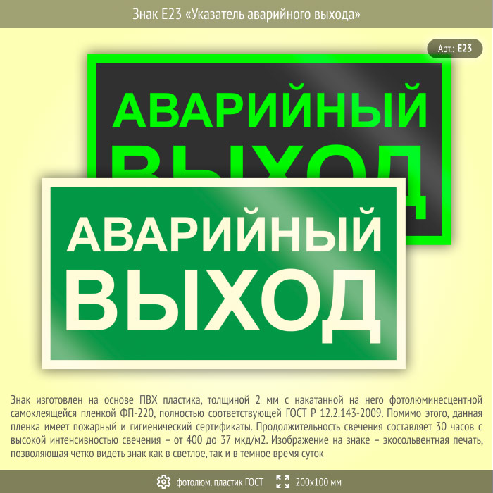 Знак E23 «Указатель аварийного выхода» (фотолюминесцентный пластик ГОСТ 34428-2018, 200х100 мм) в Хотьково купить