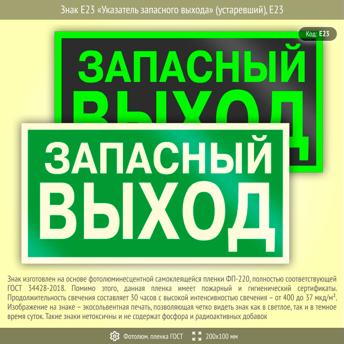 Знак E23 «Указатель запасного выхода» (устаревший) (фотолюминесцентная пленка ГОСТ 34428-2018, 200х100 мм) в Хотьково купить