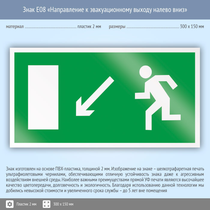 Знак E08 «Направление к эвакуационному выходу налево вниз» (пластик, 300х150 мм) в Хотьково купить