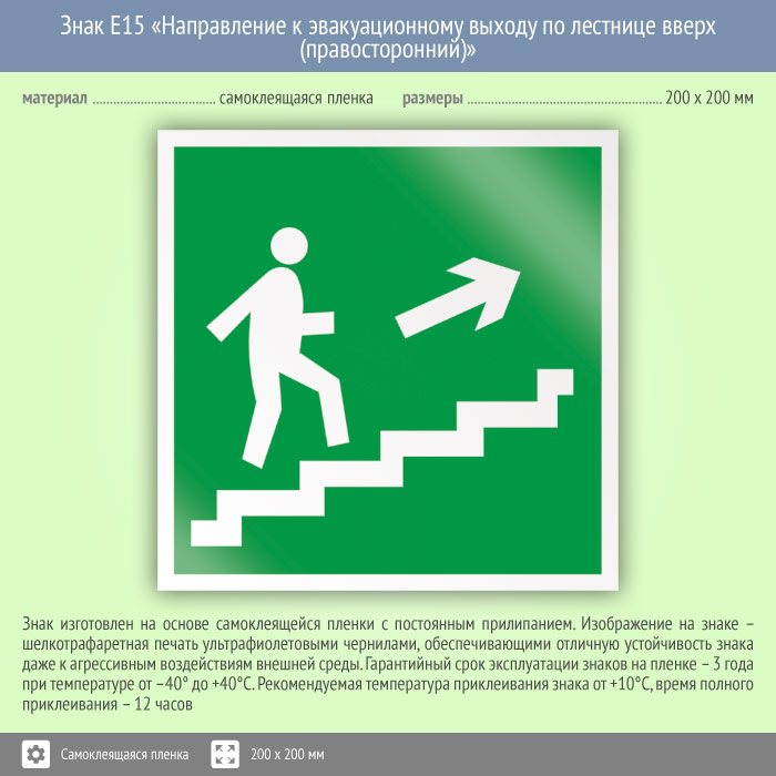 Знак E15 «Направление к эвакуационному выходу по лестнице вверх (правосторонний)» (пленка, 200х200 мм) в Хотьково купить