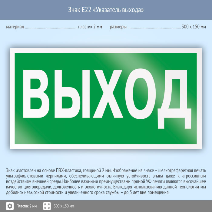 Знак E22 «Указатель выхода» (пластик, 300х150 мм) в Хотьково купить