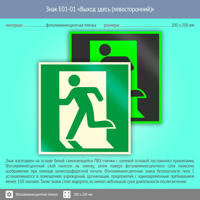 Знак E01-01 «Выход здесь (левосторонний)» (фотолюминесцентная пленка, 200х200 мм) в Хотьково купить