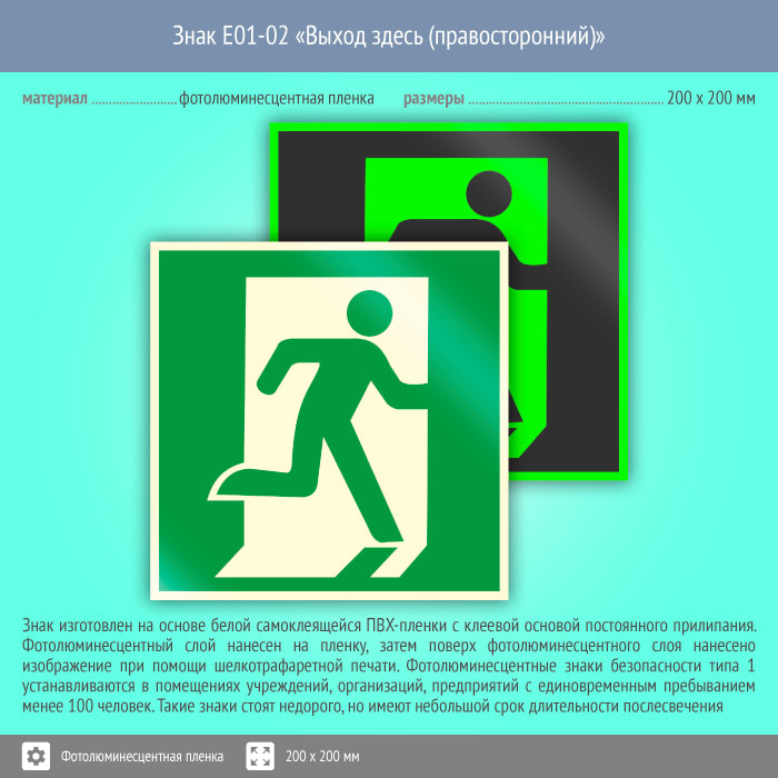 Знак E01-02 «Выход здесь (правосторонний)» (фотолюминесцентная пленка, 200х200 мм) в Хотьково купить