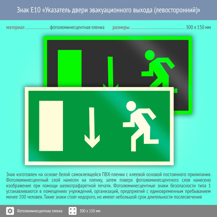 Знак E10 «Указатель двери эвакуационного выхода (левосторонний)» (фотолюминесцентная пленка, 300х150 мм) в Хотьково купить