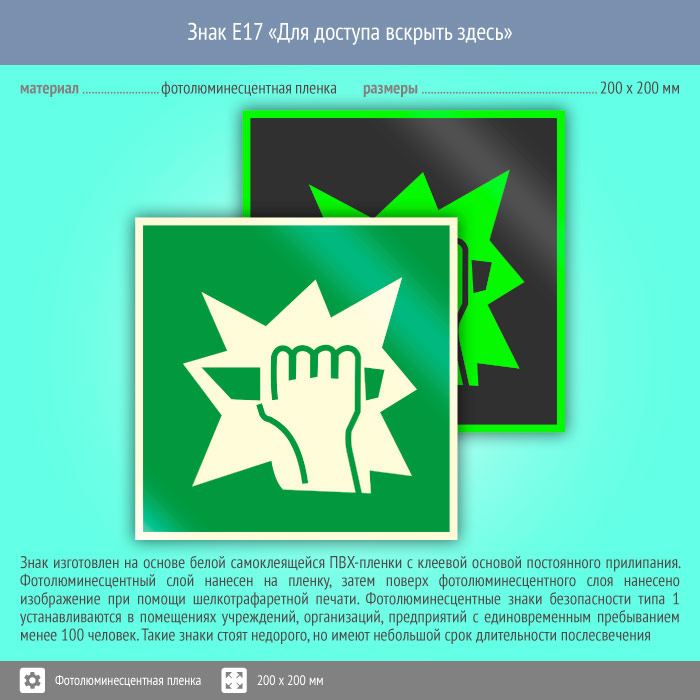 Знак E17 «Для доступа вскрыть здесь» (фотолюминесцентная пленка, 200х200 мм) в Хотьково купить