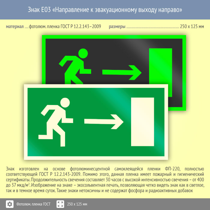 Знак E03 «Направление к эвакуационному выходу направо» (фотолюминесцентная пленка ГОСТ 34428-2018, 250х125 мм) в Хотьково купить