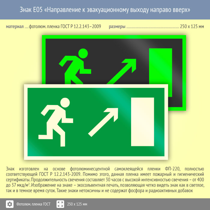 Знак E05 «Направление к эвакуационному выходу направо вверх» (фотолюминесцентная пленка ГОСТ 34428-2018, 250х125 мм) в Хотьково купить