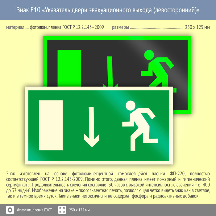 Знак E10 «Указатель двери эвакуационного выхода (левосторонний)» (фотолюминесцентная пленка ГОСТ 34428-2018, 250х125 мм) в Хотьково купить