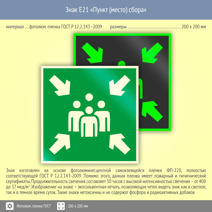 Знак E21 «Пункт (место) сбора» (фотолюминесцентная пленка ГОСТ 34428-2018, 200х200 мм) в Хотьково купить