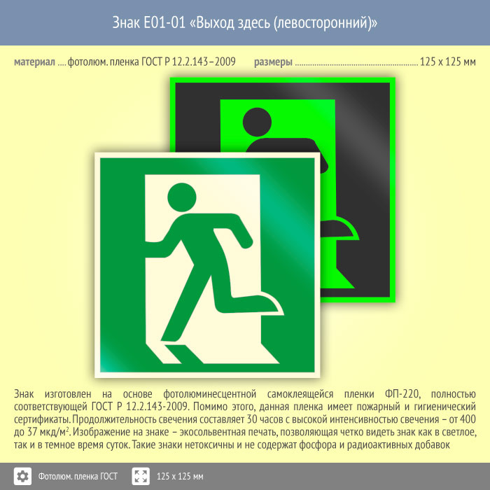 Знак E01-01 «Выход здесь (левосторонний)» (фотолюминесцентная пленка ГОСТ 34428-2018, 125х125 мм) в Хотьково купить