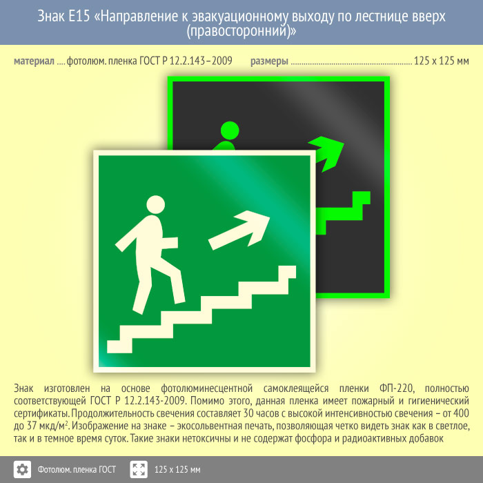Знак E15 «Направление к эвакуационному выходу по лестнице вверх (правосторонний)» (фотолюминесцентная пленка ГОСТ 34428-2018, 125х125 мм) в Хотьково купить