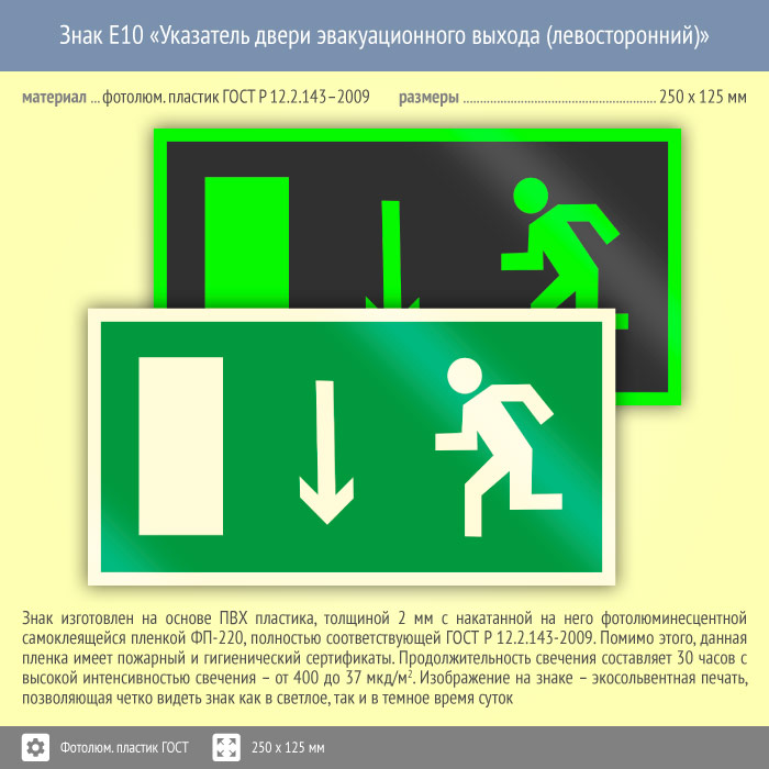 Знак E10 «Указатель двери эвакуационного выхода (левосторонний)» (фотолюминесцентный пластик ГОСТ 34428-2018, 250х125 мм) в Хотьково купить