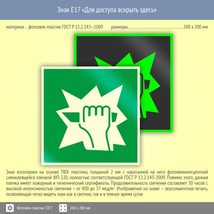 Знак E17 «Для доступа вскрыть здесь» (фотолюминесцентный пластик ГОСТ 34428-2018, 200х200 мм) в Хотьково купить