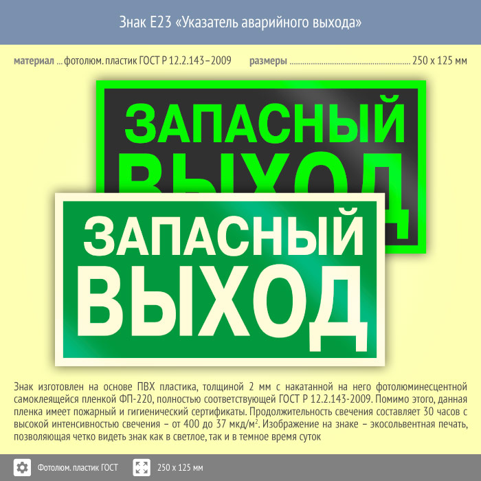 Знак E23 «Указатель запасного выхода» (устаревший) (фотолюминесцентный пластик ГОСТ 34428-2018, 250х125 мм) в Хотьково купить